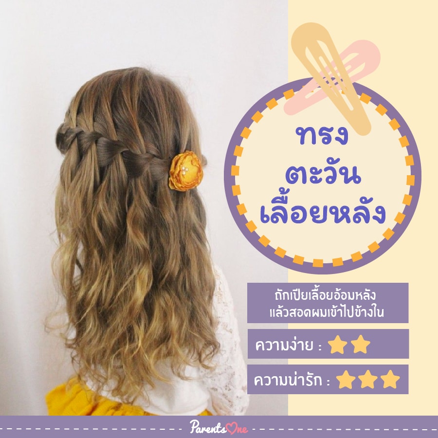 ทรงนี้เป็นทรงที่ลูกจะรู้สึกสบายหัวมากๆ เพราะแค่ถักเปียอ้อมหลัง แล้วเว้นระยะห่างระหว่างช่องเปียไว้พอควร จากนั้นจึงนำผมข้างหน้าที่เหลือมาทำเป็นช่อ แล้วสอดผมเข้าไปข้างใน เพียงเท่านี้ก็จะได้ทรงผมที่ไม่ลงมาปิดหน้า ส่วนข้างหลังก็สวยงามเป็นระเบียบเหมือนไม้เลื้อยแล้ว