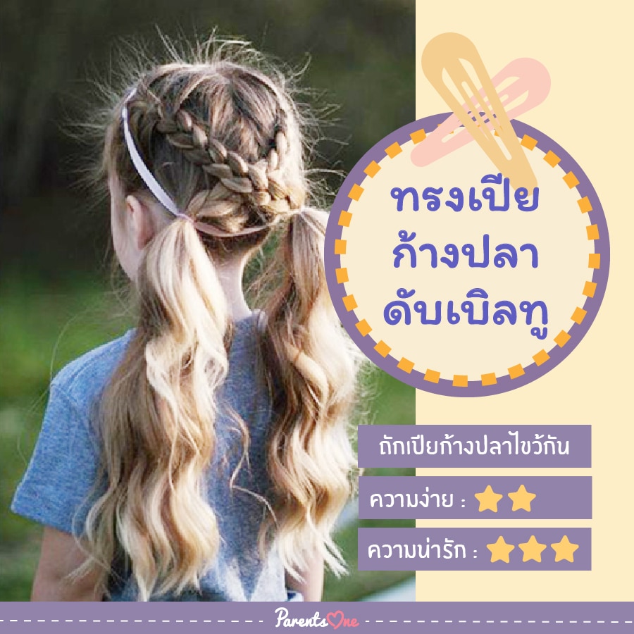 การทำทรงนี้คุณพ่อคุณแม่อาจจะต้องมีทักษะในการถักเปียบ้างพอสมควร เพราะต้องถักเปียก้างปลาให้ลูกทั้ง 2 ข้างก่อน แล้วจึงค่อยม้วนปลายผมขึ้น ไม่ให้ผมหล่นลงมา ทรงนี้รับรองว่าลูกต้องชอบแน่นอน เพราะน่ารักและเรียบร้อยในเวลาเดียวกัน รับรองเลยว่า ถ้าทำทรงนี้อยู่ได้ทั้งวันแน่นอน