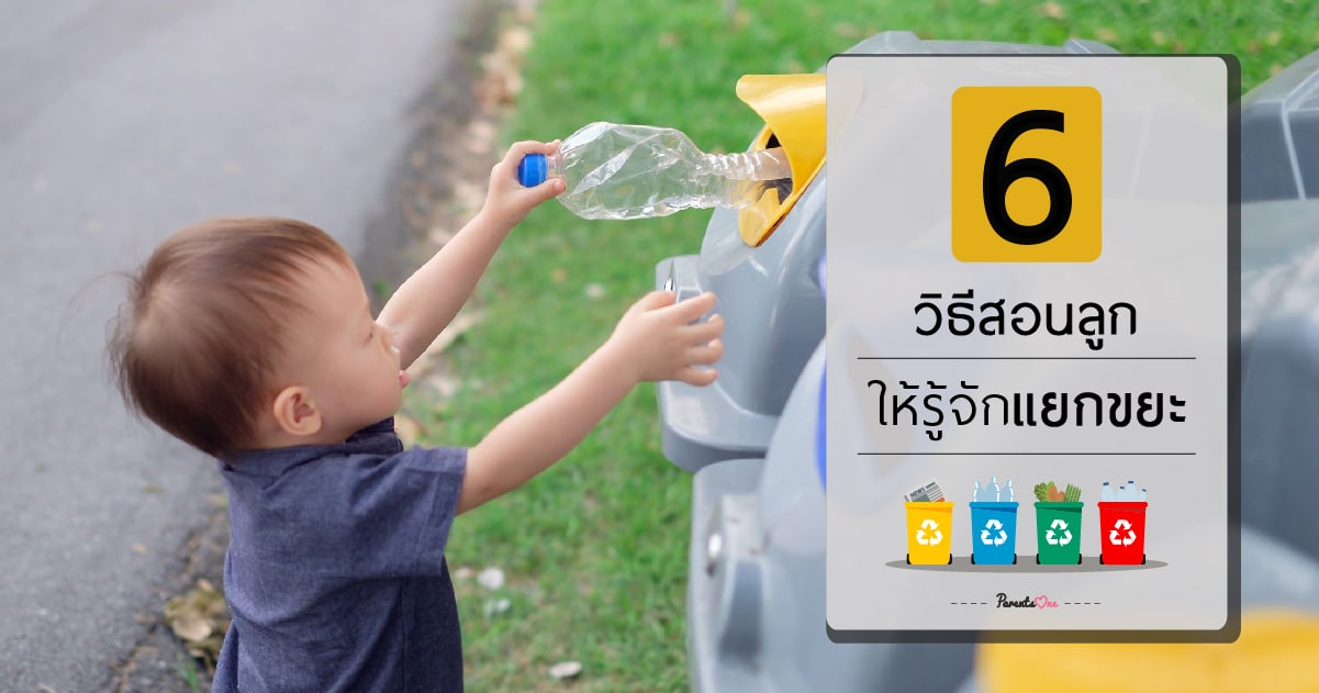 เมื่อเป็นแบบอย่างที่ดีให้ลูกแล้ว คุณพ่อคุณแม่อย่าลืมสอนวิธีการแยะขยะที่ถูกต้อง ถูกประเภท ให้ด้วยนะคะ และสอนให้ลูกทิ้งขยะให้ถูกวิธีทั้งในบ้านและนอกบ้าน เพื่อปลูกฝังให้ลุกรู้จักรับผิดชอบต่อตนเองและสังคม อาจจะใช้วิธีการสอนแบบเล่นเกมก็ได้ เช่น เกมจับคู่ภาพขยะที่เป็นประเภทเดียวกัน เกมจับคู่ภาพกับคำ เกมเรียงลำดับภาพการกำจัดขยะ เป็นต้น
