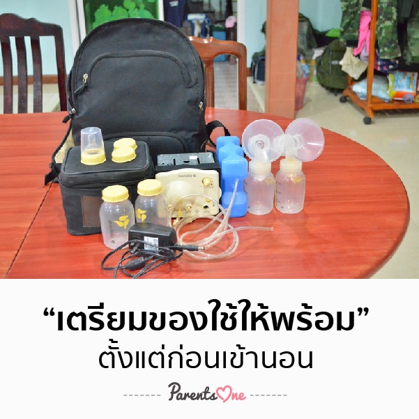 จัดอุปกรณ์สำหรับปั๊ม และเก็บน้ำนมใส่กระเป๋า พร้อมทั้งเลือกชุดใส่ไปทำงานให้เหมาะและสะดวกกับการปั๊มนม และไม่ลืมที่จะล้างทำความสะอาดอุปกรณ์ไว้ให้เรียบร้อยก่อนค่ะ