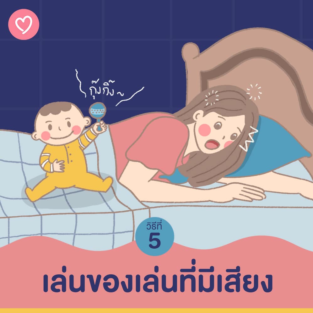 วิธีสุดท้ายก็คือการเล่นของเล่นที่มีเสียง เจ้าตัวเล็กอาจมีของเล่นชิ้นโปรดที่มักจะวางไว้ใกล้ๆ เตียง พอเขาตื่นขึ้นมาปุ๊บก็หยิบของเล่นมาเล่นปั๊บ และโดยปกติของเล่นที่เด็กเล็กชอบก็จะเป็นพวกของเล่นที่มีเสียงกุ๊งกิ๊งๆ หรือมีเสียงที่ค่อนข้างดัง เลยเป็นนาฬิกาปลุกชั้นดีที่ทำให้คุณแม่ตื่นได้นั่นเองค่ะ