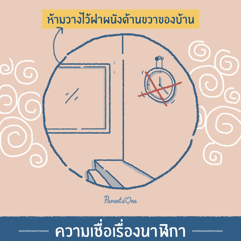 - ถ้าวางนาฬิกาที่ฝาผนังด้านขวาของบ้าน จะเป็นสิ่งที่ไม่ดี ถ้าอยากให้ดีต้องเป็นผนังด้านซ้าย เปรียบเสมือนมังกร และอีกความเชื่อหนึ่งบอกว่าห้ามวางนาฬิกาให้ตรงกับประตูบ้าน เพราะเชื่อว่าเป็นสัญลักษณ์ของการหมดอายุขัยนั้นเองค่ะ