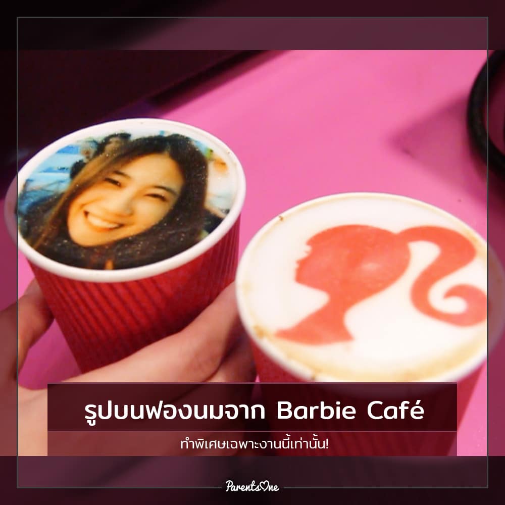 • ซื้อเครื่องดื่มแก้วโปรดได้โดยที่มีหน้าบาร์บี้สุดน่ารักอยู่บนฟองนม ด้วยระบบการปริ้นท์สีจากเครื่อง Coffee print ที่ใช้หมึกกินได้มาสร้างรูปภาพบนฟองนม