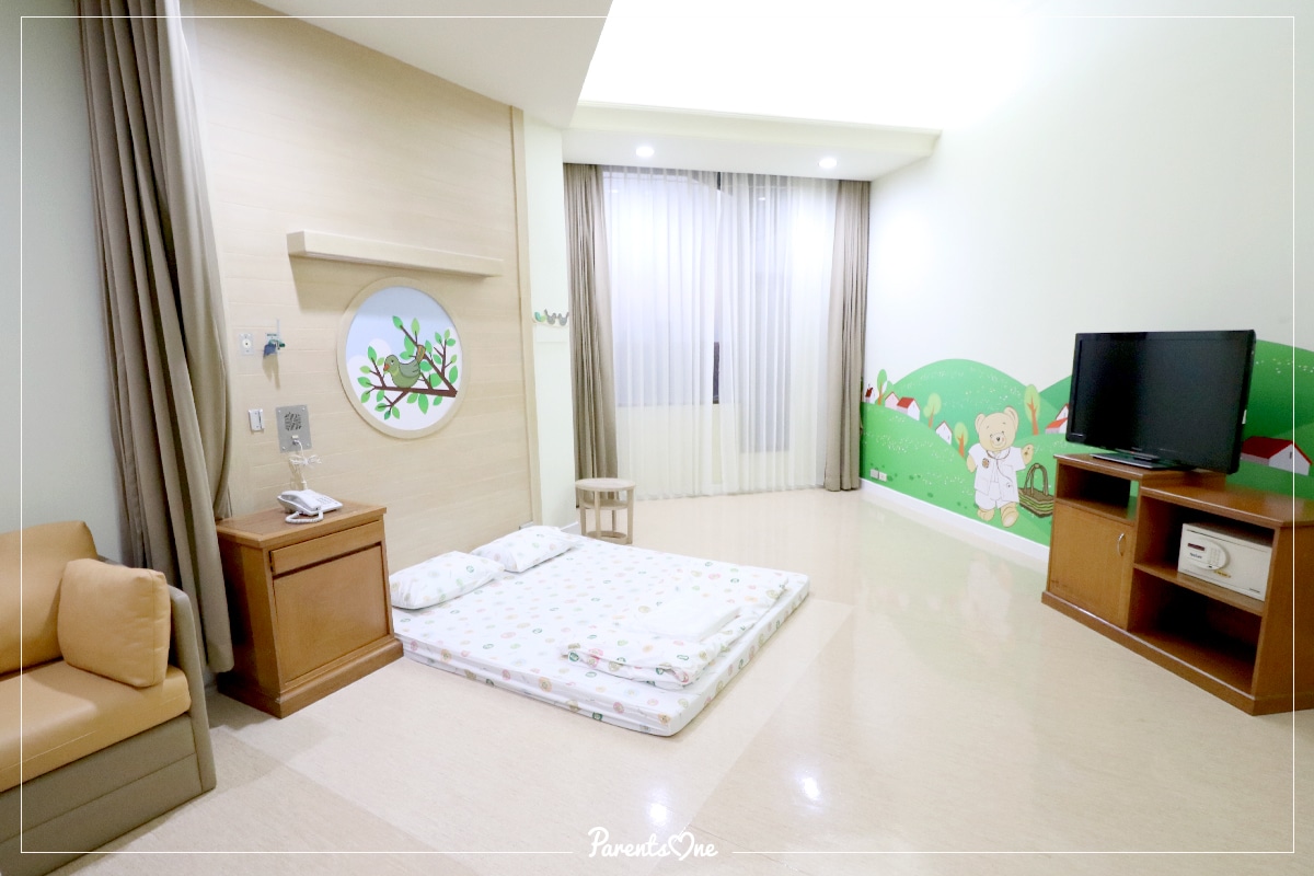 ห้องผู้ป่วยเด็ก (Standard) : ตกแต่งห้องด้วยสีโทนอุ่น พร้อมกับวอลล์เปเปอร์สุดน่ารักๆ เหมาะกับเป็นห้องพักสำหรับเด็กๆ มากเลยทีเดียว ห้องแบบนี้จะมีทั้งเตียงและที่นอนแบบปูไม่ยกสูงเหมาะกับเด็กเล็ก เพื่อป้องกันอันตรายจากการตกเตียงนั่นเอง แถมคุณแม่ยังสามารถนอนกับลูกได้อย่างสบาย นอกจากนี้ ภายในห้องยังมีสิ่งอำนวยความสะดวกมากมายอีกด้วย