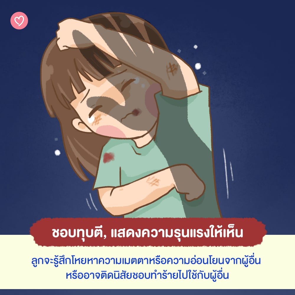 ชอบทุบตี, แสดงความุรนแรงให้เห็น : ลูกจะรู้สึกโหยหาความเมตตาหรือความอ่อนโยนจากผู้อื่น , ติดนิสัยชอบทำร้ายไปใช้กับผู้อื่น