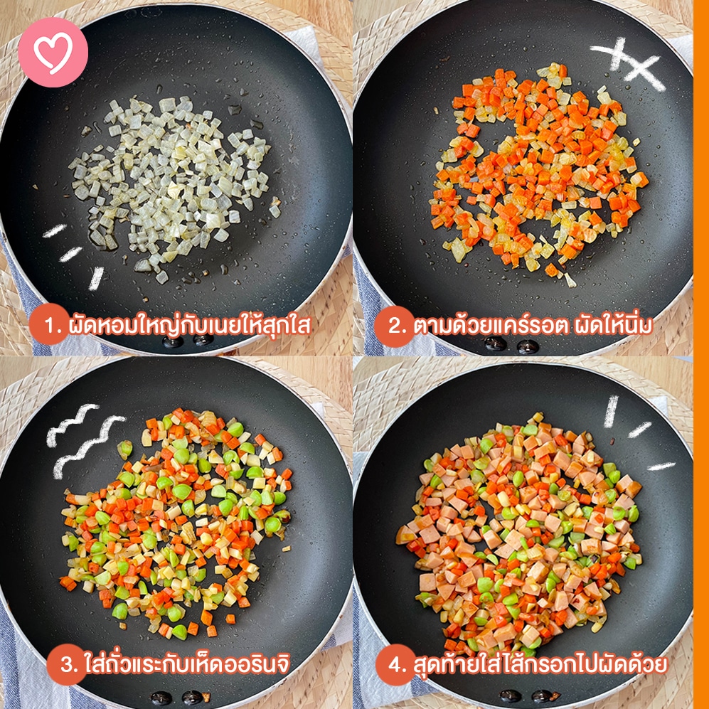 เริ่มจากทำไส้กันก่อน โดยผัดหอมใหญ่ เห็ดออรินจิ แคร์รอต ถั่วแระญี่ปุ่น และไส้กรอกให้เข้ากันด้วยเนย ผัดให้แคร์รอตและหอมใหญ่นิ่ม