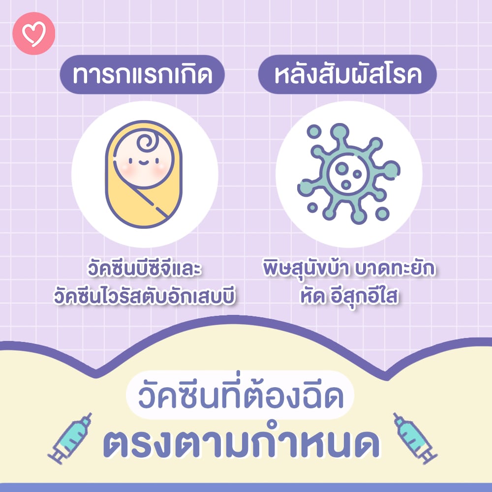 - วัคซีนสำหรับทารกแรกเกิด ได้แก่ วัคซีนบีซีจี และวัคซีนไวรัสตับอักเสบบี