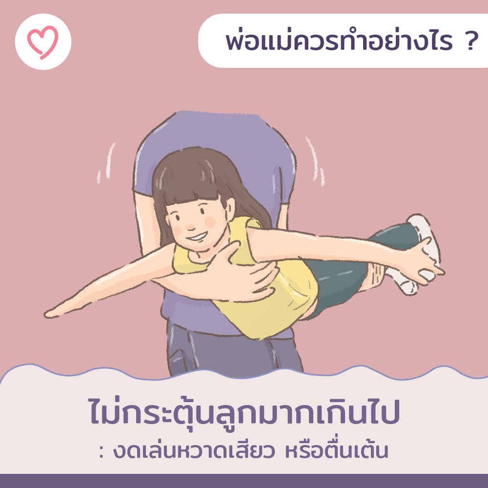 - อย่ากระตุ้นลูกมากจนเกินไปในเวลากลางวัน : คุณพ่อคุณแม่ต้องงดการเล่นที่หวาดเสียว หรือตื่นเต้น รุนแรง เพราะการถูกกระตุ้นแบบนี้อาจจะทำให้ลูก มีอาการตกใจและนอนละเมอในตอนกลางคืนได้ค่ะ