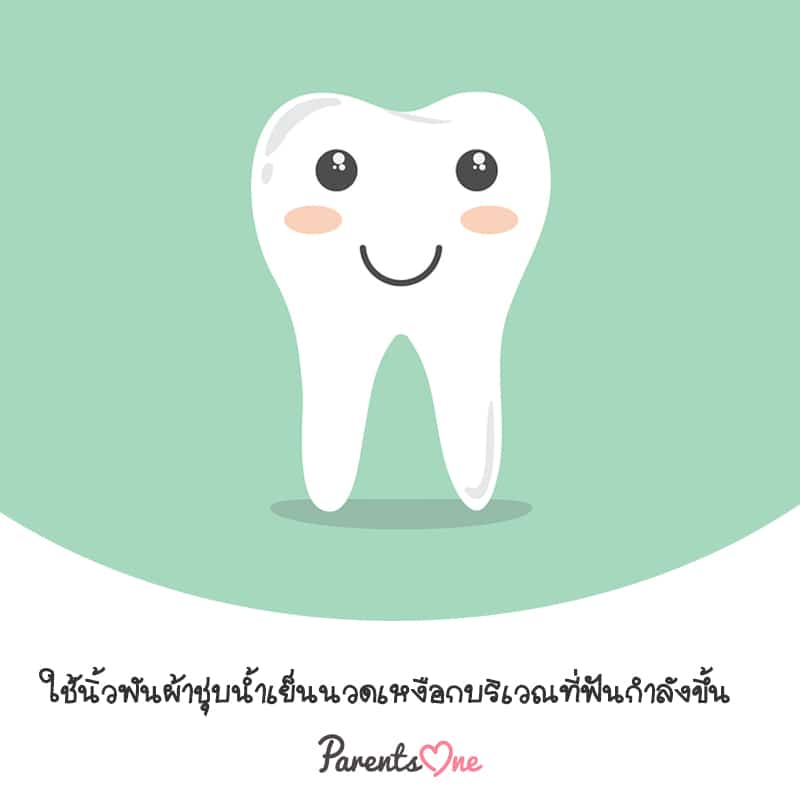 เพราะความเย็นจะบรรเทาความเจ็บปวดของลูกได้ เลยอยากให้คุณแม่ลองใช้นิ้วพันผ้าชุบน้ำเย็นนวดเหงือกบริเวณที่ฟันกำลังขึ้นค่ะ