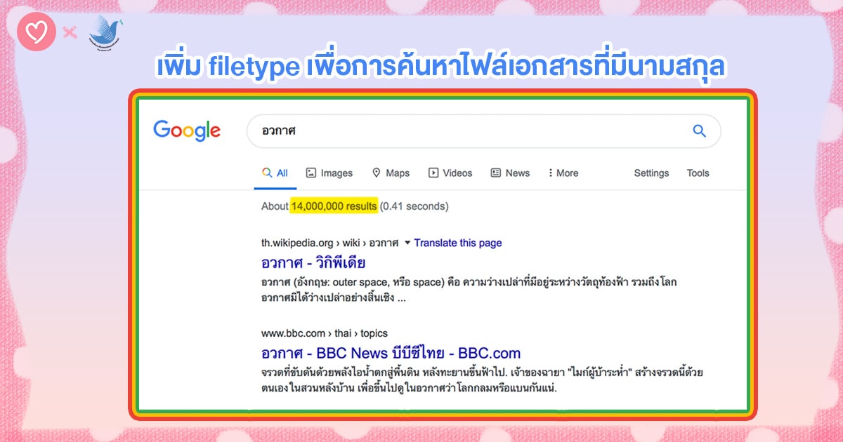 หากต้องการหาข้อมูลที่มีความเฉพาะเจาะจงว่าอยากได้ข้อมูลในรูปแบบไหน ก็สามารถใส่ filetype หรือประเภทของข้อมูลในการค้นหาได้ เช่น อยากได้ข้อมูลเกี่ยวกับ อวกาศ ในรูปแบบของไฟล์ doc. ก็สามารถค้นหาด้วยคำว่า อวกาศ filetype:doc เพียงเท่านี้ข้อมูลที่ขึ้นมาก็จะอยู่ในรูปแบบของไฟล์ doc. ทั้งหมด