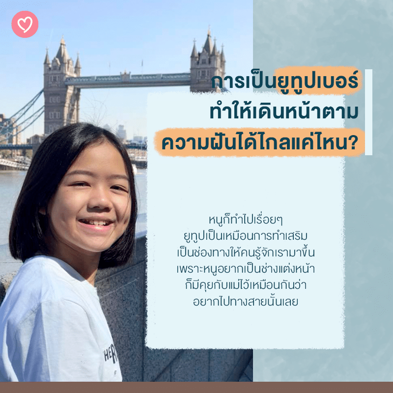 น้องแพรพาเพลิน : จริงๆ หนูก็ทำไปเรื่อยๆ ยูทูปเป็นเหมือนการทำเสริม เป็นช่องทางให้คนรู้จักเรามาขึ้น เพราะหนูอยากเป็นช่างแต่งหน้า ก็มีคุยกับแม่ไว้เหมือนกันว่าอยากไปทางสายนั้นเลย
