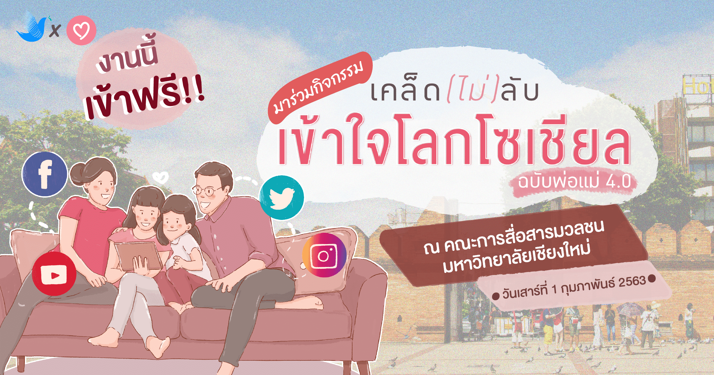 Parents One ได้จัดกิจกรรม “เคล็ด(ไม่)ลับ เข้าใจโลกโซเชียล ฉบับพ่อแม่ 4.0” เพื่อเตรียมความพร้อมให้คุณพ่อคุณแม่รับมือเข้าใจเกี่ยวกับโลกโซเชียล และเคล็ดลับเลี้ยงลูกอย่างไร ไม่ให้ติดจอ พร้อมกับพิธีกรและแขกรับเชิญสุดพิเศษ ในวันเสาร์ที่ 1 กุมภาพันธ์ พ.ศ.2563 จัดที่คณะการสื่อสารมวลชน มหาวิทยาลัยเชียงใหม่ งานนี้เข้าฟรี!! อย่าลืมมาร่วมกิจกรรมกันเยอะๆ นะคะ