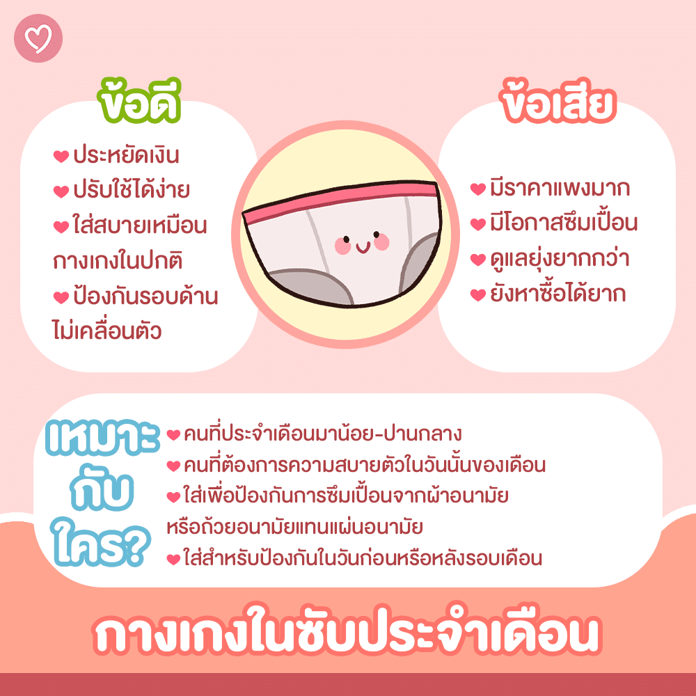 • วิธีดูแลซับซ้อนกว่ากางเกงในปกติ ควรซักทันทีหลังใช้และทำตามคำแนะนำของผู้ผลิต