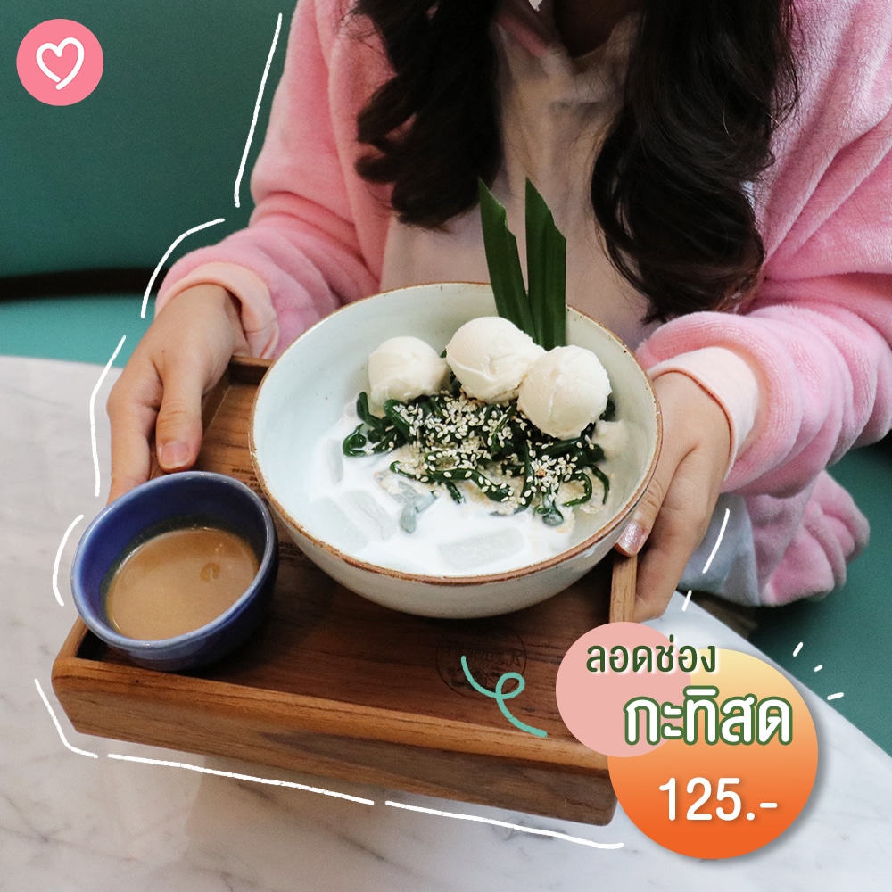 มีของคาวก็ต้องมีของหวานใช่ไหมล่ะคะ แน่นอนว่าที่โอ้กะจู๋ก็ยังคงเป็นอาหารเพื่อสุขภาพ ขนาดของหวานยังเป็นของหวานเพื่อสุขภาพเลย โดยเมนูนี้จะเป็นลอดช่องกะทิสด แต่ว่ามีความพิเศษตรงที่เส้นลอดช่องทำมาจากต้นข้าวสาลีอ่อนปราศจากแป้ง