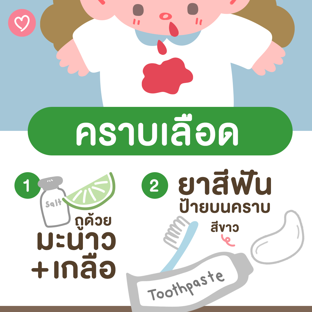 เลือดกำเดากับเด็กๆ แทบจะเป็นของคู่กัน ไม่แปลกเลยที่ลูกรักจะมีคราบเลือดแห้งกรังติดเสื้อผ้ากลับบ้านมาบ้าง งานนี้มะนาวและเกลือต้องผนึกกำลังกันขจัดคราบ โรยเกลือบนคราบแล้วนำมะนาวครึ่งซีกมาถู พักรอให้แห้งแล้วซักด้วยน้ำสะอาด คราบแห้งของเลือดก็จะหลุดออกไป หรือจะใช้ยาสีฟันสีขาวป้ายลงบนคราบ รอจนแห้งแล้วซักด้วยน้ำเย็นก็ได้เช่นเดียวกัน