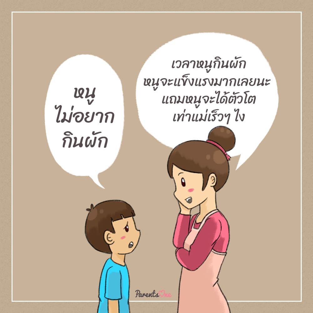 ลองพูด : เวลาหนูกินผักหนูจะแข็งแรงมากเลยนะ แถมหนูจะได้ตัวโตเท่าแม่เร็วๆ ไง